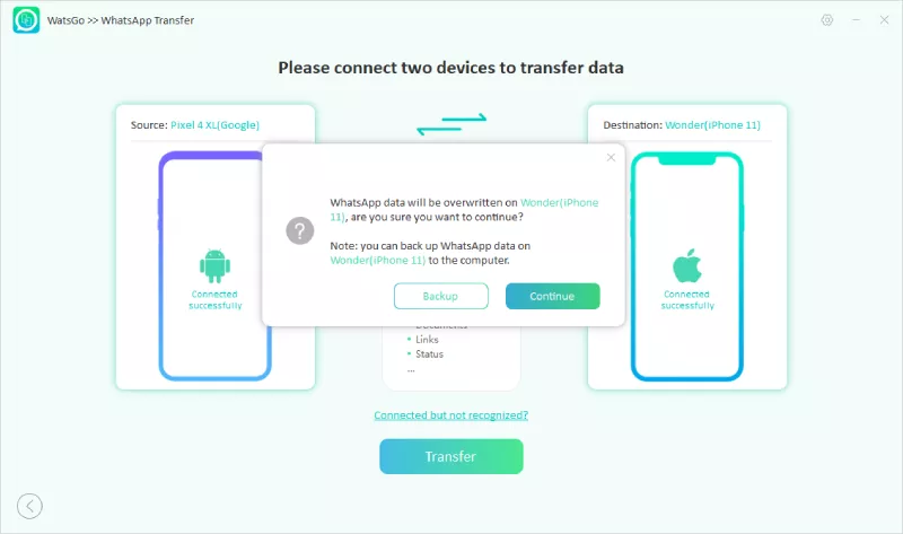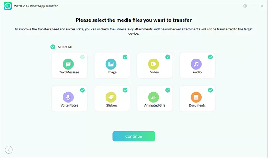 Una volta che la connessione è stabilita con successo, il programma ti avvisa che il tuo iPhone (ossia il dispositivo di destinazione) verrà sovrascritto. Assicurati quindi di eseguire il backup per evitare la perdita di dati. Seleziona i dati di WhatsApp da trasferire, come Immagini, Video, Audio, Adesivi, Note Vocali, Documenti, ecc. I messaggi di testo sono selezionati e trasferiti per impostazione predefinita. Puoi toccare Seleziona Tutto o segnare le tue preferenze singolarmente.
