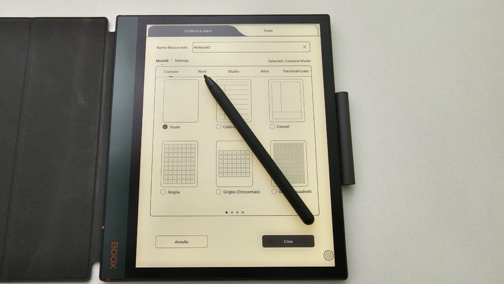 Il dispositivo ha un’app di note preinstallata che ci è piaciuta molto: possiamo scegliere fra diversi tipi di scrittura (matita, penna stilografica, penna a sfera, pennarello o evidenziatore) e per ognuno di questi possiamo selezionare lo spessore della linea e il colore che, naturalmente vedremo soltanto dopo avere esportato il contenuto su un monitor a colori, vista la presenza del display in bianco e nero.