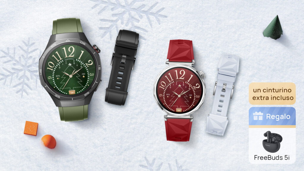 Ma le sorprese non finiscono qui. Con l’arrivo del Natale, infatti, Huawei presenta due nuove versioni Christmas Limited Edition dello smartwatch WATCH GT 5 (qui la nostra prova). La versione Black Christmas Edition, da 46mm, è disponibile in un pacchetto con un cinturino speciale extra in colorazione Green al prezzo di 259 euro, con HUAWEI FreeBuds 5i in regalo. La versione Milanese da 41mm, invece, è disponibile con un cinturino speciale extra in colorazione Red al prezzo di 309 euro, con HUAWEI FreeBuds 5i in regalo.
