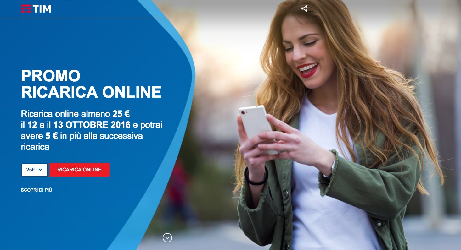 “Se effettui una Ricarica online di almeno 25€ dal sito www.tim.it, m.tim.it, Timinternet (in connessione mobile), da App MyTIM Mobile e App Timinternet dalle ore 00:01 del 12 ottobre 2016 alle ore 23:59 del 13 ottobre 2016, TIM ti premia con 5€ aggiuntivi di Ricarica che potrai ottenere effettuando una successiva Ricarica online entro 30 giorni. Da venerdì 14 ottobre ti verrà inviato un Codice Sconto via email o SMS, che potrai utilizzare entro 30 giorni nel seguente modo: