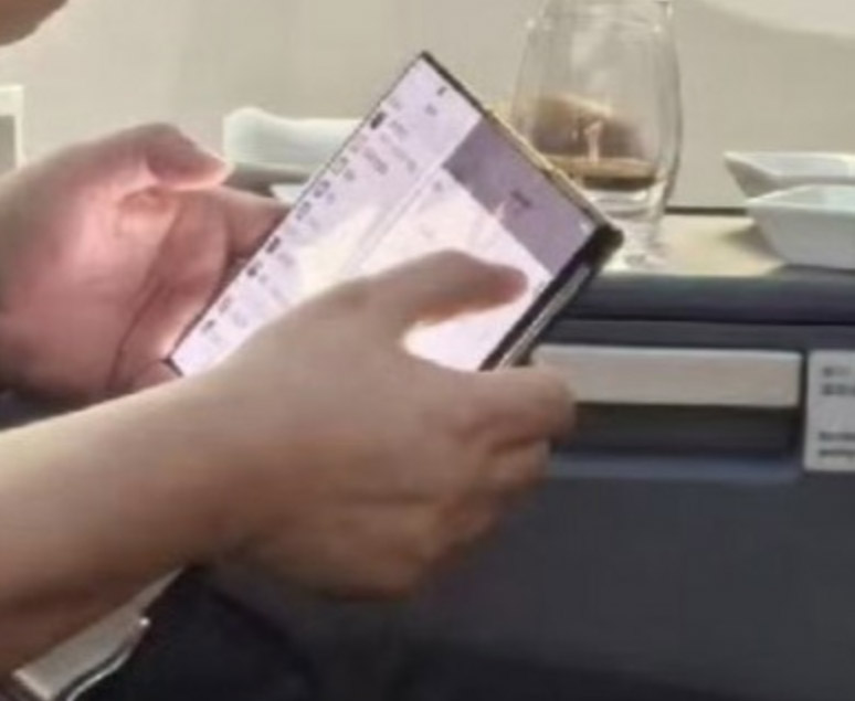 L’immagine che pubblichiamo in questa pagina mostra proprio l’alto dirigente con un dispositivo tri-folding di Huawei fra le mani, comodamente seduto in quella che appare come una business class di una compagnia aerea.