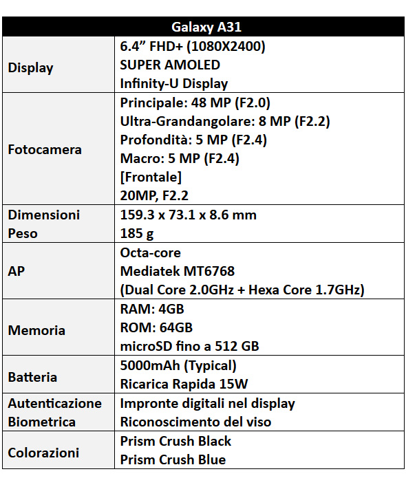 Si arricchisce la gamma di smartphone coreani con l’arrivo fra qualche settimana nei negozi del nuovo Samsung Galaxy A31, un medio di gamma in vendita a 299,90 euro nelle due colorazioni Prism Crush Black e Prism Crush Blue. Il modello vanta caratteristiche interessanti e un elegante design sottile: solo 8,6 mm lo spessore della scocca.