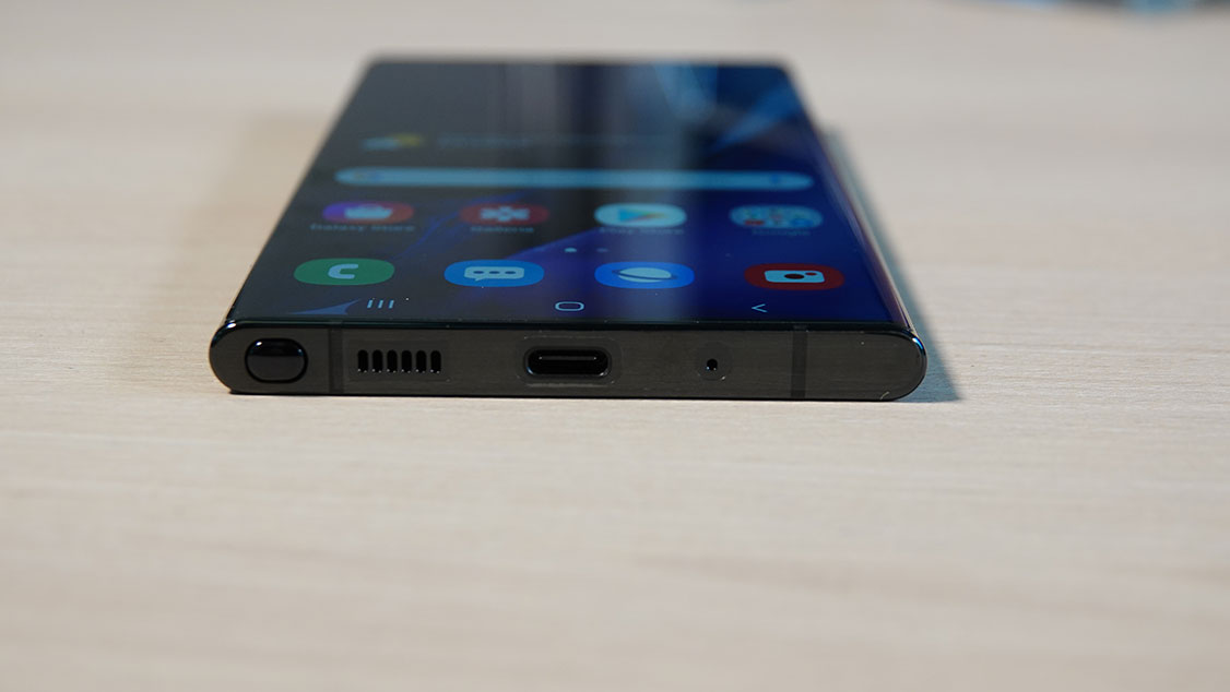 Le linee di Galaxy Note20 Ultra sono scandite dal suo display, un pannello praticamente privo di cornici. Lo smartphone misura 164,8×77,2×8,1 millimetri e pesa 208 grammi. Non un peso piuma (in tasca si sente), ma un dispositivo solido fra le mani, con linee decise, corpo in metallo e colori ricercati di indubbia bellezza. Mystic Bronze, il colore del modello ricevuto in prova, è diventato il colore flagship di tutta la linea e permea anche gli auricolari Buds Live e lo smartwatch Galaxy Watch 3. Piace, attrae sguardi e soprattutto si sporca poco (grazie anche a un effetto satinato e al disegno della texture). La S Pen, alloggiata sul bordo inferiore sinistro, è perfettamente integrata con lo chassis e si estrae con una leggera pressione.