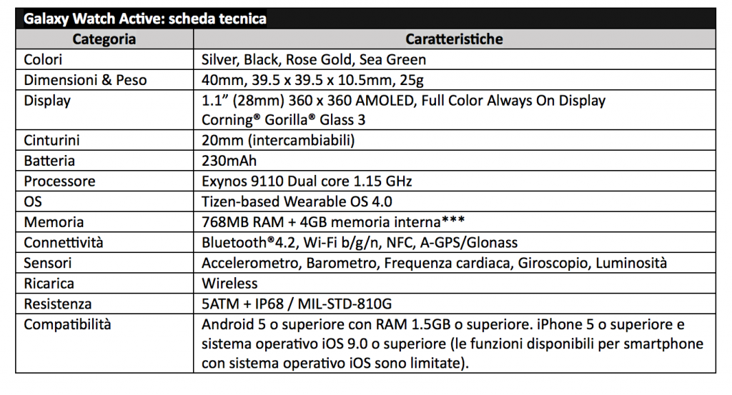 Galaxy Watch Active è in vendita nelle principali insegne di elettronica di consumo e negli shop online nelle colorazioni Silver, Black, Rose Gold e Green al prezzo di 249 euro. Acquistando il nuovo Galaxy Watch Active dal 15 al 29 marzo si ha la possibilità di ricevere in omaggio il Samsung Wireless Battery Pack (EB-U1200CSEGWW), il caricabatterie portatile che consente di ricaricare device in modalità wireless, in modo da non rimanere mai a corto di energia anche quando non c’è nessuna presa a disposizione. Per poter usufruire della promozione e ricevere il Samsung Wireless Battery Pack direttamente a casa è sufficiente, dopo aver acquistato Galaxy Watch Active, registrare su Samsung Members il prodotto.