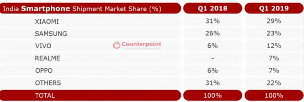 In India, Samsung dichiara una quota di mercato del 77% nel segmento premium locale, che – in questa area geografica – corrisponde a una soglia sopra i 400 dollari. Tuttavia, il produttore sudcoreano deve far fronte a una forte concorrenza da parte di Xiaomi e Oppo nei segmenti più bassi del mercato. Sulla base dei dati pubblicati da Counterpoint, durante il trimestre che termina a marzo, Samsung ha spedito il 23% di tutti gli smartphone distribuiti nel Paese indiano.