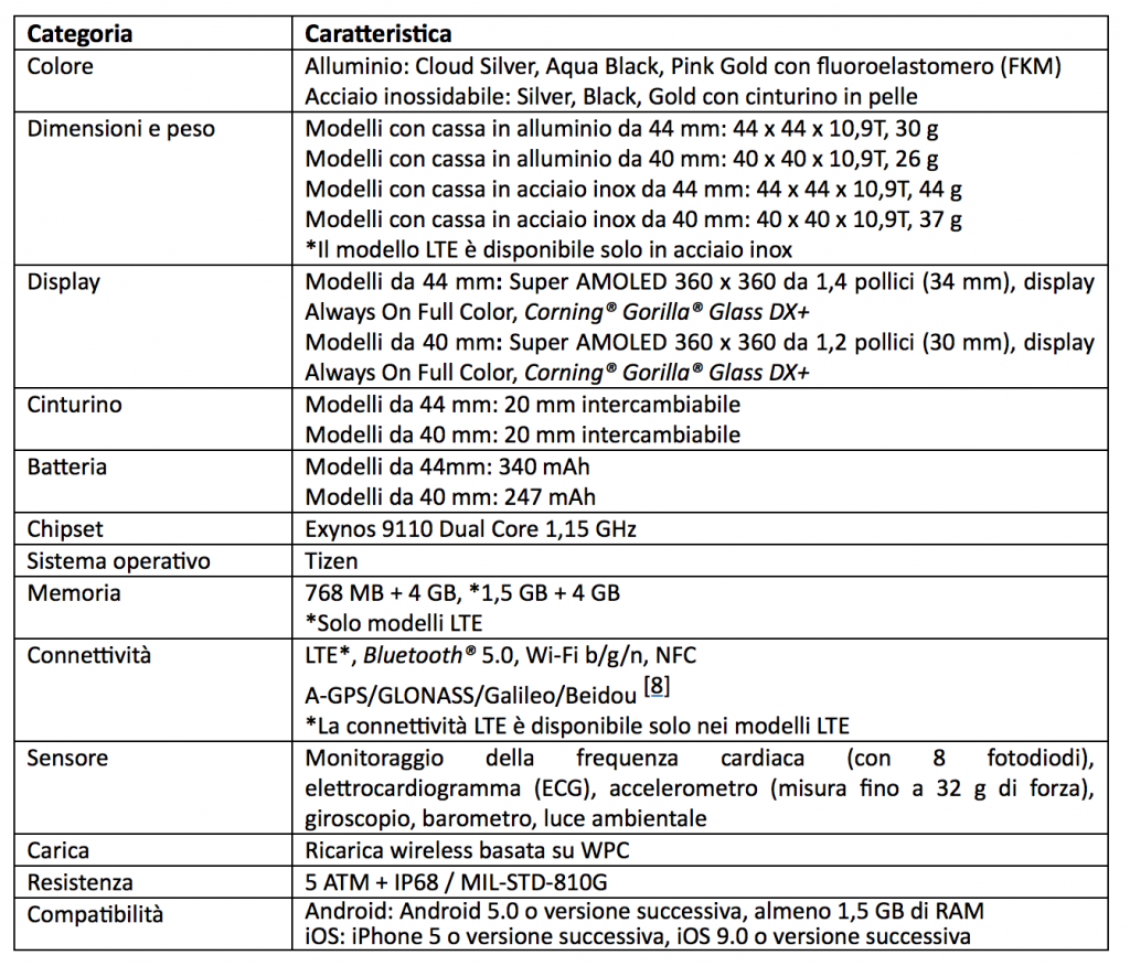 Entrambi i modelli hanno uno schermo Super AMOLED con risoluzione 360 x 360 pixel. La versione da 40 mm ha un display da 1,2 “, il 44 mm ha una schermata da 1,4”. L’orologio è mosso dal chipset Exynos 9110 con 768 MB di RAM e integra il sistema operativo Tizen.