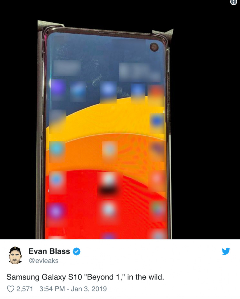 L’anno si apre con una nuova immagine del Samsung Galaxy S10. Gli scatti provengono da un tweet di Evan Blass, che di questi tempi è probabilmente fra i più informati al mondo sui modelli di smartphone in fase di lancio. La foto di Galaxy S10 che vedete in questa pagina mostra chiaramente la scomparsa del notch e il display “Infinity O” di Samsung.