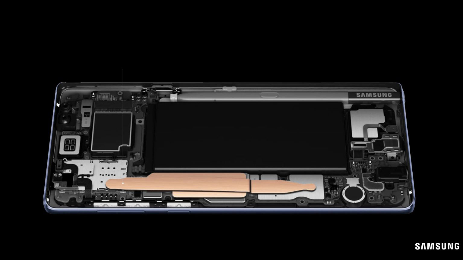 Galaxy Note 9 è dotato di un diffusore termico che secerne acqua. Il modulo è stato progettato per assorbire il calore generato da batteria e chip per poi trasformarlo in vapore. Dopo che lo smartphone è stato raffreddato, il vapore si condensa nuovamente in acqua, viene riassorbito dallo spargitore e il processo può ricominciare nuovamente.