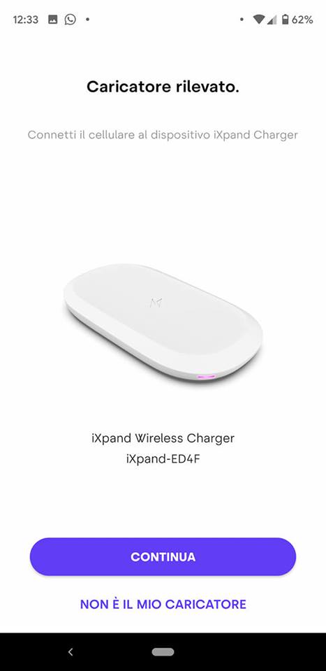 Ultimata l’installazione, collegate la basetta di ricarica alla corrente elettrica, poi aprite l’app. A questo punto il vostro smartphone rileverà l’iXpand Wireless Charger. Cliccate su continua per andare avanti.