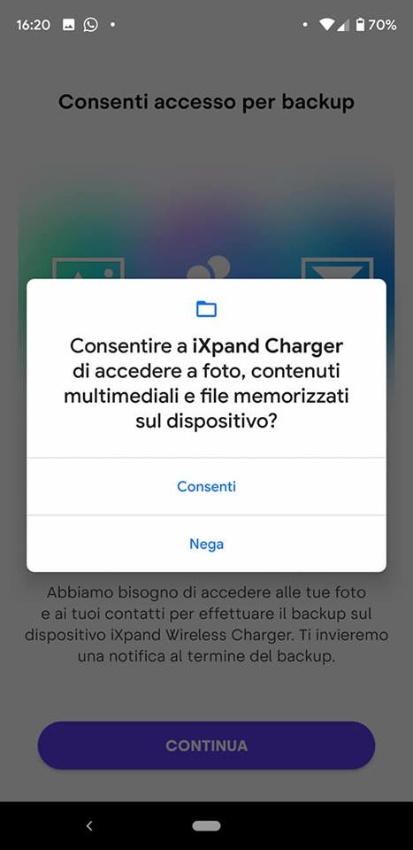 Perfetto. La procedura di installazione è quasi terminata. Non vi rimane che concedere i permessi all’app per il salvataggio di foto e contatti…