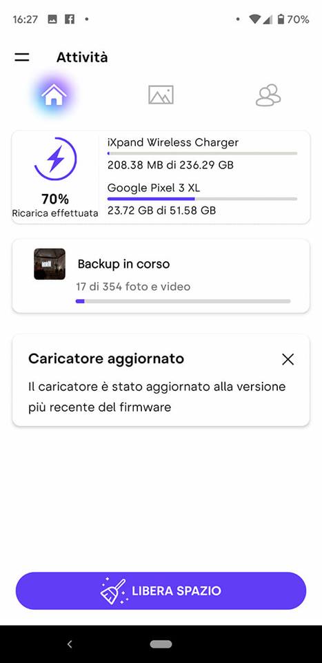 Dopo aver cliccato su Consenti arriverete alla schermata finale dell’app, che poi sarà quella che vedrete da qui in poi. Nella parte alta viene indicata la percentuale di carica del telefono, a fianco la memoria utilizzata dall’iXpand charger e quella del vostro telefono. Il backup, da qui in poi, avverrà in maniera automatica. A voi rimane il compito, quando volete, di liberare la memoria del telefono cliccando su: “libera spazio“.