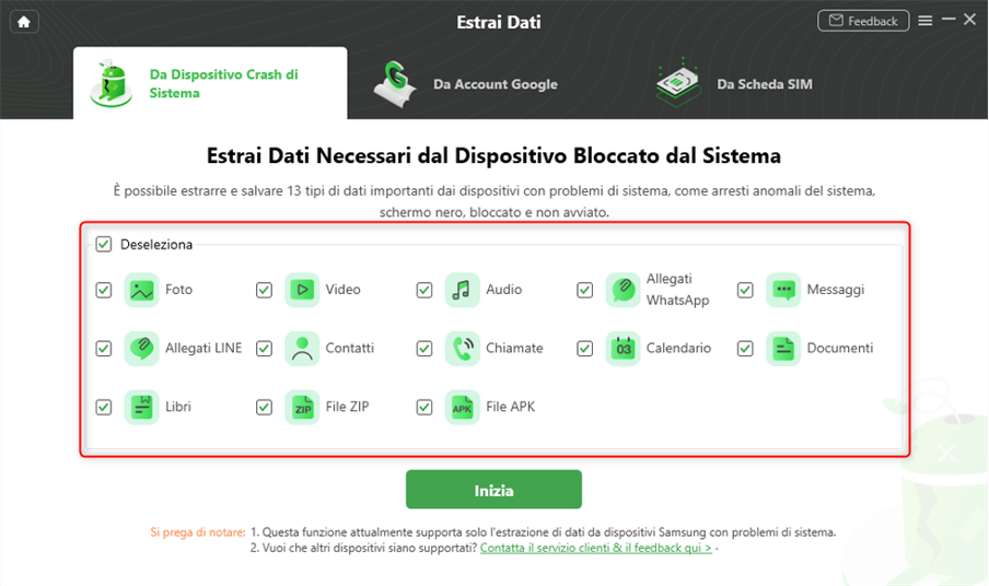 Una volta che il telefono è stato riconosciuto dal software, seleziona i dati che desideri estrarre e fai clic su Inizia.