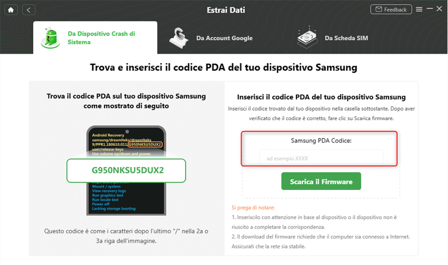 Inserisci il codice PDA del tuo telefono Samsung in questa pagina e fai clic su “Scarica firmware”.