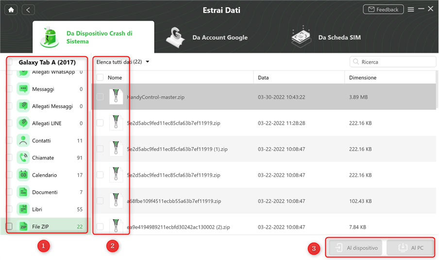 Visualizza i dati sullo schermo Samsung danneggiato qui, puoi selezionare i dati che desideri estrarre, fai clic su Al PC.