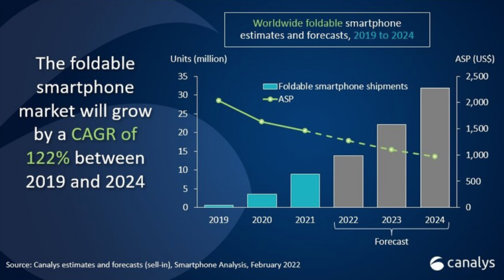 Si tratterebbe di un tasso di crescita annuale del 53% tra il 2021 e il 2024. Allo stesso tempo, Canalys prevede che il prezzo medio di vendita (ASP) dei pieghevoli diminuirà della metà rispetto ai valori del 2019 a circa 1.000 dollari nel 2024.