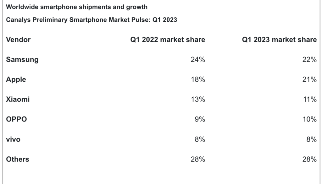 Samsung ha ripreso il primo posto da Apple che subisce un normale calo dovuto alla decrescita del driver rappresentato dalla serie iPhone 14 Pro, mentre Xiaomi mantiene il terzo posto.