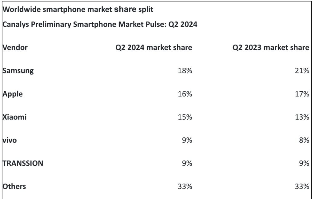 Samsung ha mantenuto la leadership, ma il suo vantaggio su Apple, seconda, è ora di soli 2 punti percentuali. Sia Samsung sia Apple hanno tuttavia perso terreno rispetto al secondo trimestre dello scorso anno, che non viene tra l’altro ricordato come uno dei migliori degli utlimi tempi.