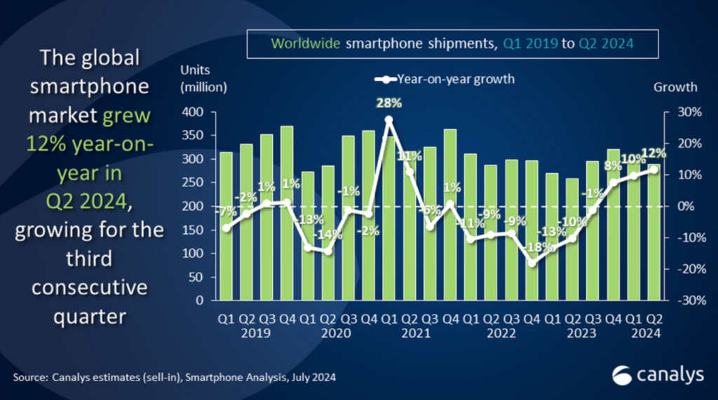 L’ultimo rapporto di Canalys, relativo al secondo trimestre dell’anno, conferma che il mercato degli smartphone è in crescita e, per la terza volta consecutiva anno su anno, mostra un segno positivo.