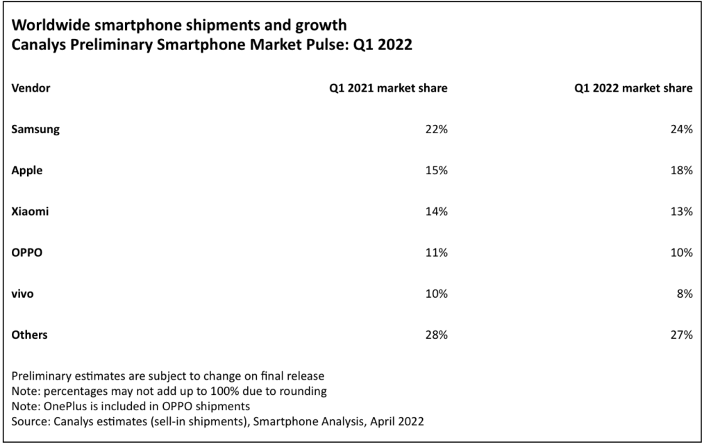 Xiaomi mantiene il terzo posto con una quota del 13%, un punto percentuale in meno rispetto allo scorso anno. La performance più forte è stata registrata dalla popolare serie Redmi Note. Oppo (i dati di Canalys includono anche i modelli di OnePlus) si attesta al 10% (in calo rispetto all’11% di un anno fa ma con un punto percentuale in più rispetto al quarto trimestre 2021).