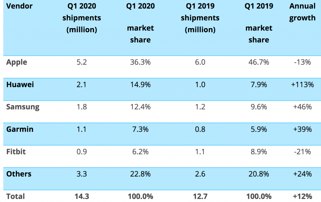 Samsung e Garmin registrano crescite importanti, anche se è Huawei (con un eccellente +113%) a portarsi al secondo posto della classifica mondiale redatta da Canalys.