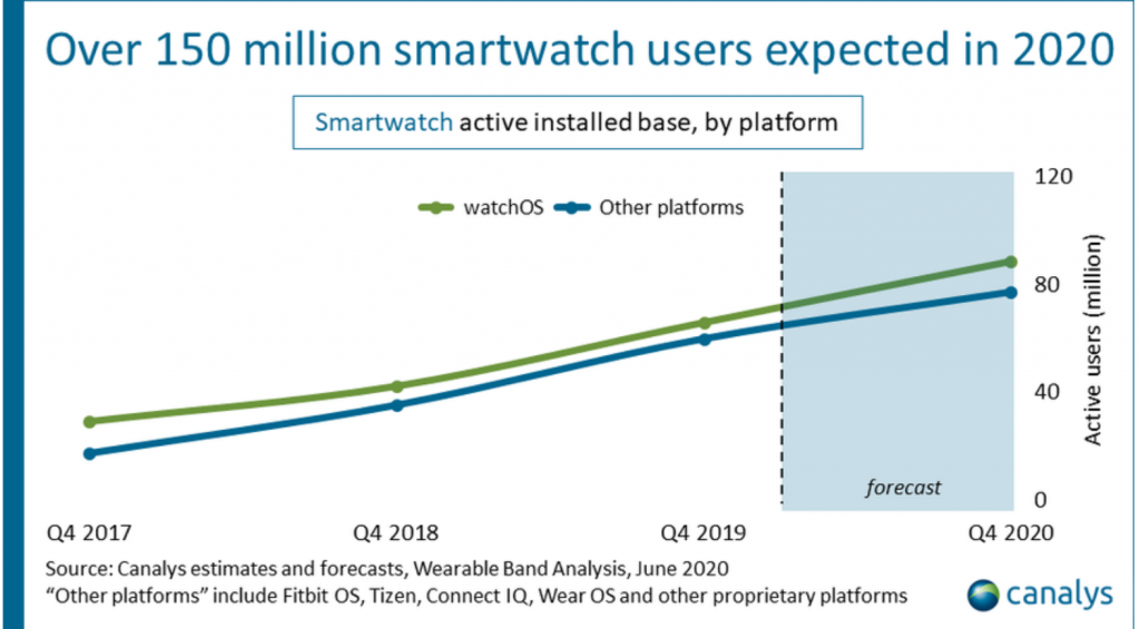Nel 2020, l’istituto di ricerca Canalys si aspetta che gli utenti di smartwatch nel mondo raggiungano quota 150 milioni.