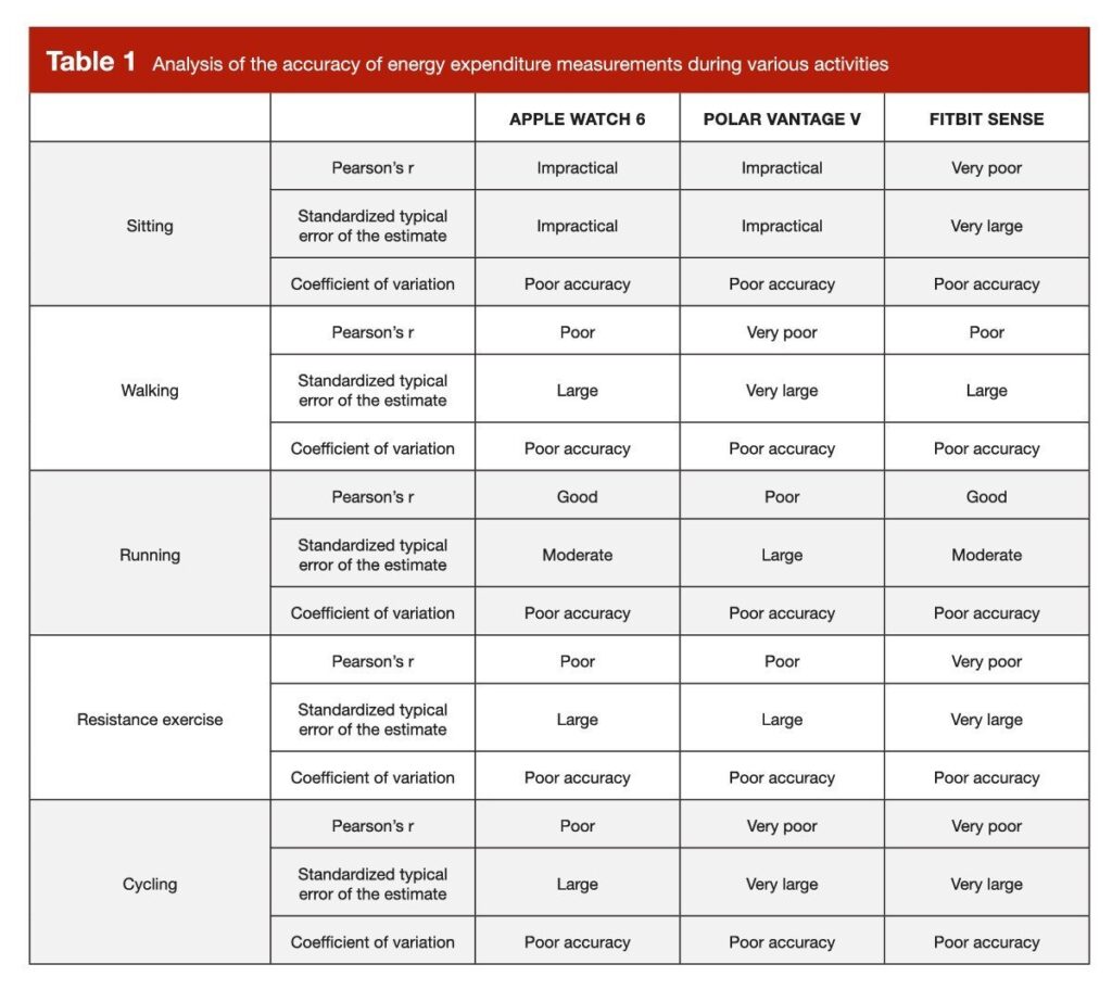 I tre orologi collegati sono stati testati da trenta partecipanti di tutti i sessi durante diversi esercizi fisici. Per le misurazioni di controllo sono stati utilizzati la fascia toracica Polar H10 e il misuratore portatile di scambio MetaMax 3B. Risultati compilati da Stronger by Science nella tabella seguente.