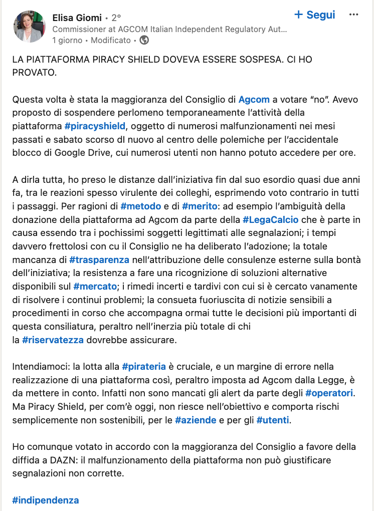 Una voce fortemente critica è quella di Elisa Giomi, commissaria AGCOM e professoressa di Sociologia alla Università Roma Tre, espressione del Movimento 5 Stelle, che in un post su LinkedIn è uscita allo scoperto e ha dichiarato apertamente: “La piattaforma Piracy Shield doveva essere sospesa. Ci ho provato”.