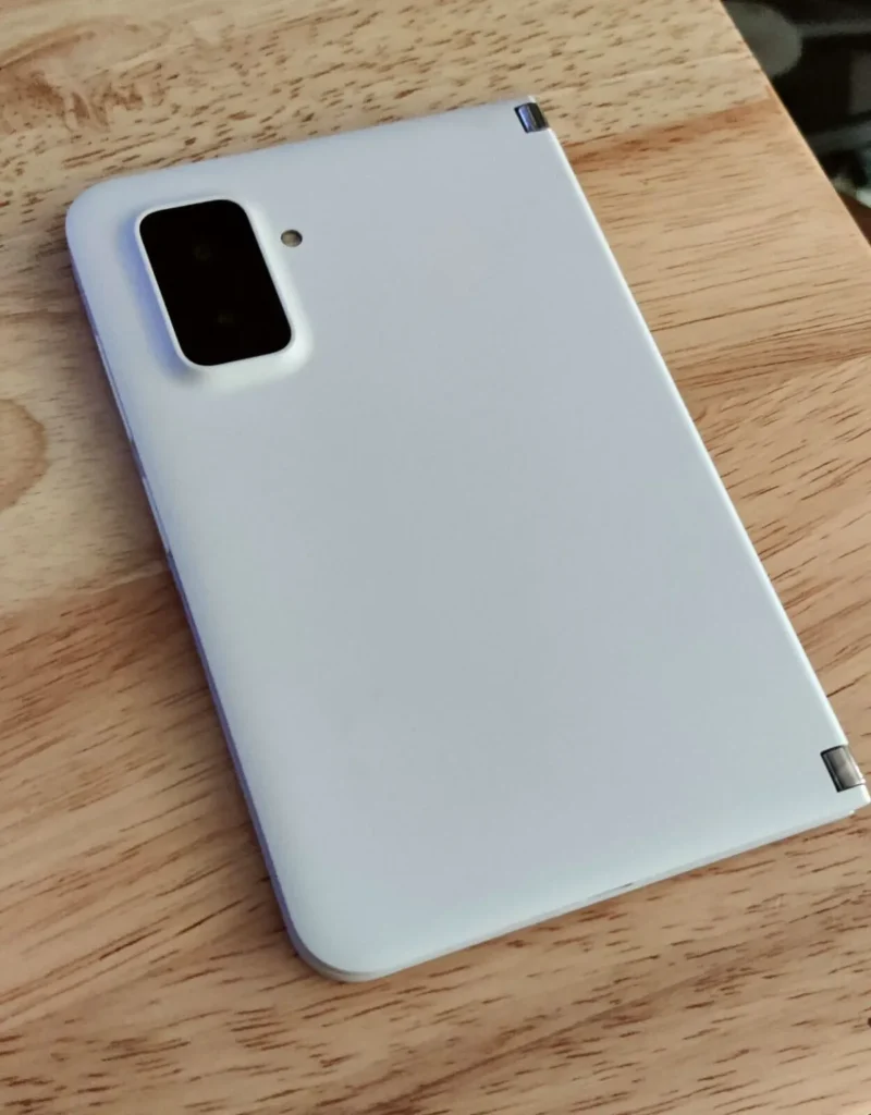 Nelle immagini fornite dall’annuncio, possiamo scoprire un dispositivo dalle forme simili a quelle del Surface Duo 2 con un design leggermente più rotondo, una finitura opaca e un modulo fotocamera meno prominente.