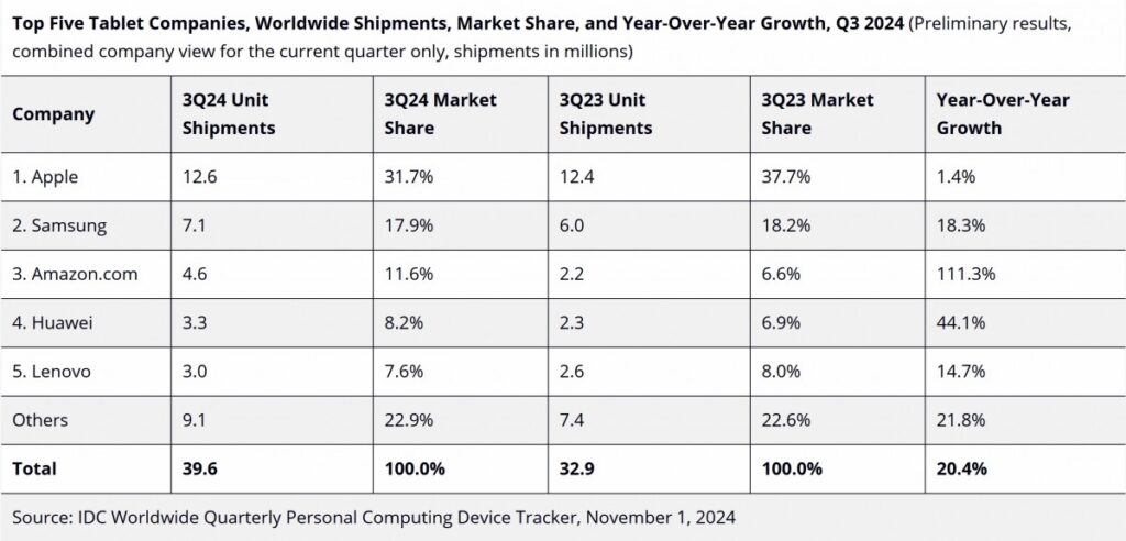 Secondo i dati di International Data Corporation (IDC), nel terzo trimestre del 2024 sono stati spediti complessivamente 39,6 milioni di tablet a livello globale, con una crescita del 20,4% su base annua. Il settore mostra segnali positivi, con Apple al comando e un significativo incremento per Amazon.