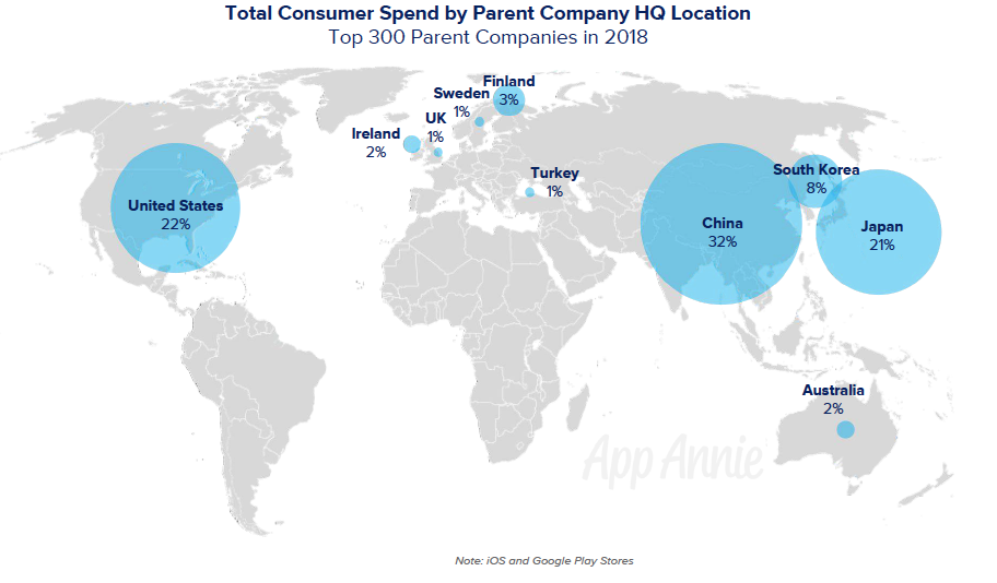Questo grafico mostra invece la percentuale di spesa generata dalle aziende con il quartier generale nei vari Paesi. Usa e Cina insieme rappresentano quasi il 50% del mercato. Da notare poi come le 5 principali società per fatturato siano tutte aziende del mondo Gaming: Tencent, NetEase, Activision Blizzard, Bandai Namco e Netmarble.