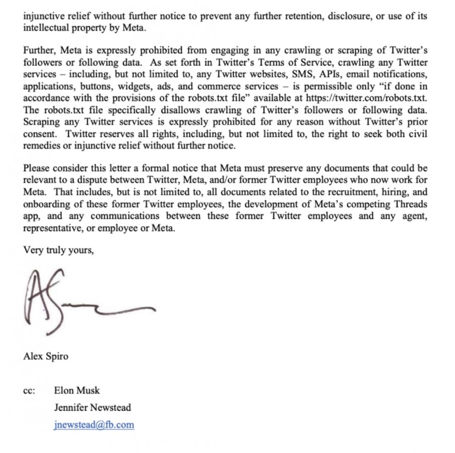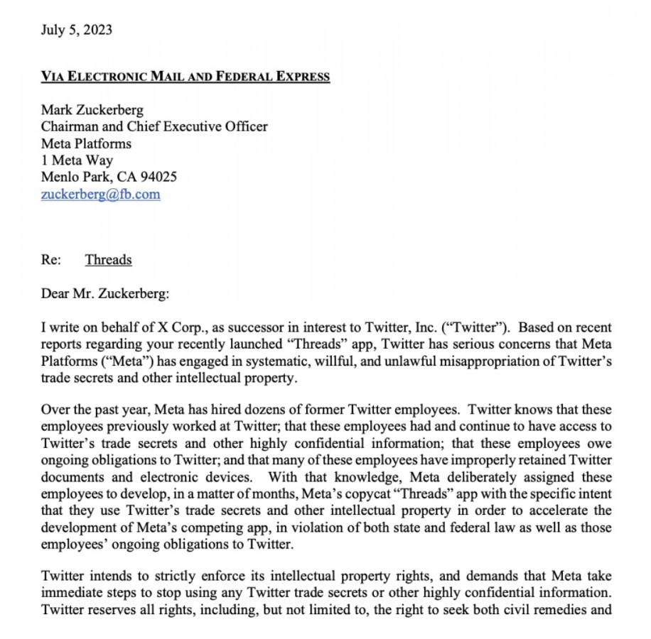 Twitter sostiene che Meta abbia assunto diversi loro ex-dipendenti che provenivano che hanno divulgato a quest’ultima segreti commerciali, utilizzati da Meta a proprio vantaggio nello sviluppo di Threads. La lettera descrive questa come un’app “copiata” da Twitter, li esorta a cessare immediatamente l’utilizzo di azioni riservate e nega loro ogni accesso alle informazioni su Twitter.