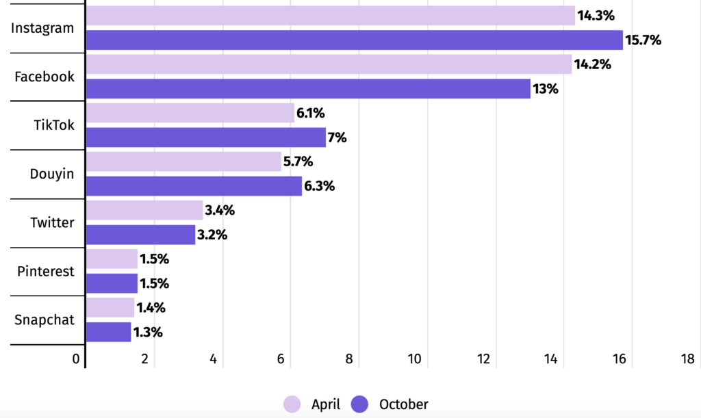 Il sondaggio di DataReportal ha mostrato che quasi il 16% degli utenti dei social media ha indicato Instagram come la piattaforma di social media numero uno, l’1,5% in più rispetto a sei mesi fa. Facebook si è classificata al secondo posto, con una quota del 13%. Tuttavia, le statistiche mostrano che il gigante dei social media ha perso un po’ di popolarità da aprile, quando il 14,2% degli utenti dei social media lo considerava la loro prima scelta.