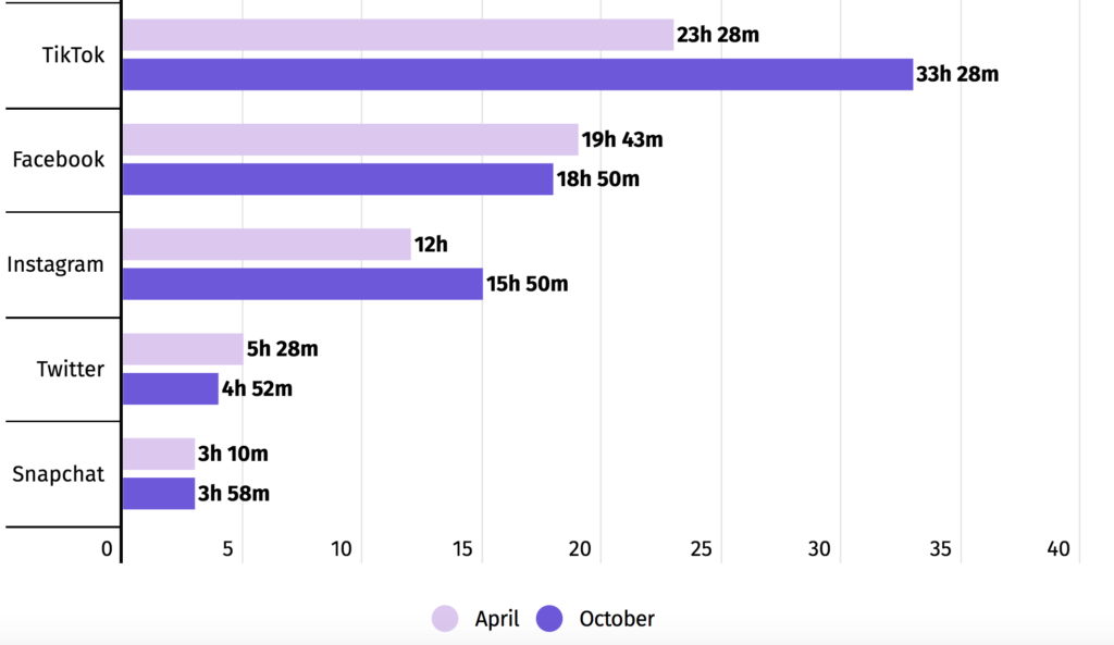 Secondo i dati presentati da OnlyAccounts.io, gli utenti dei social media trascorrono quasi 34 ore al mese su TikTok, ben dieci ore in più rispetto allo scorso anno.