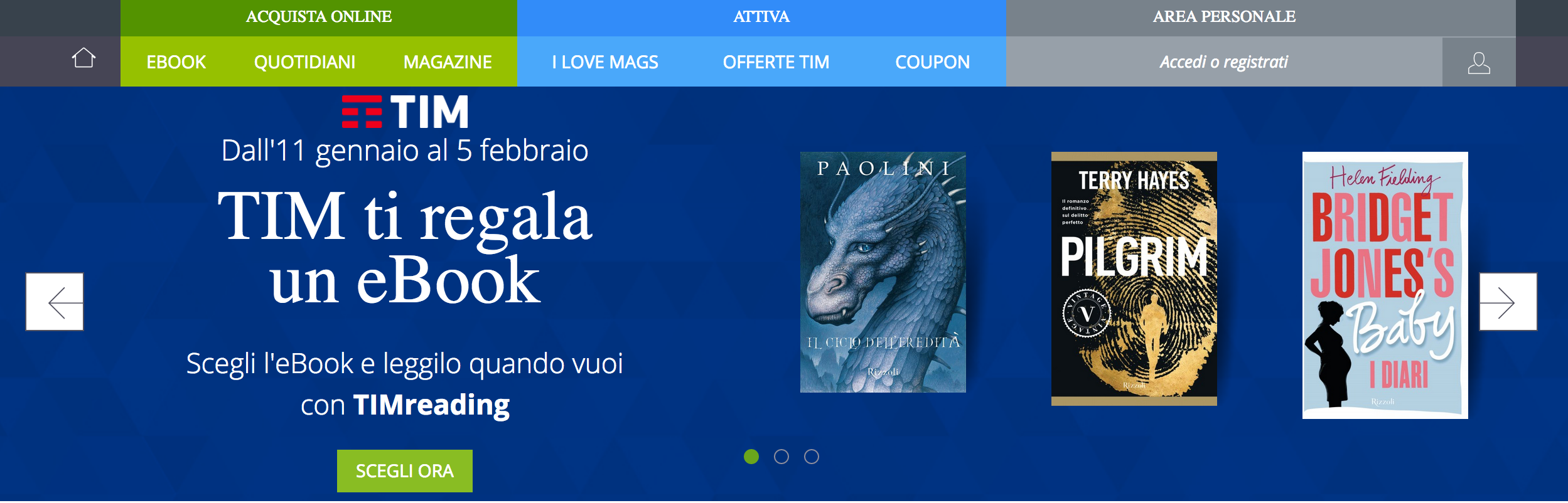 Tim inoltre riserva a tutti i propri clienti consumer, ricaricabili e abbonati con profilo dati attivo, un ebook gratuito a scelta tra tre titoli editi da Rizzoli: Bridget Jones’s Baby – I diari, di Helen Fielding; Pilgrim, di Terry Hayes; Il ciclo dell’eredità, di Christopher Paolini.