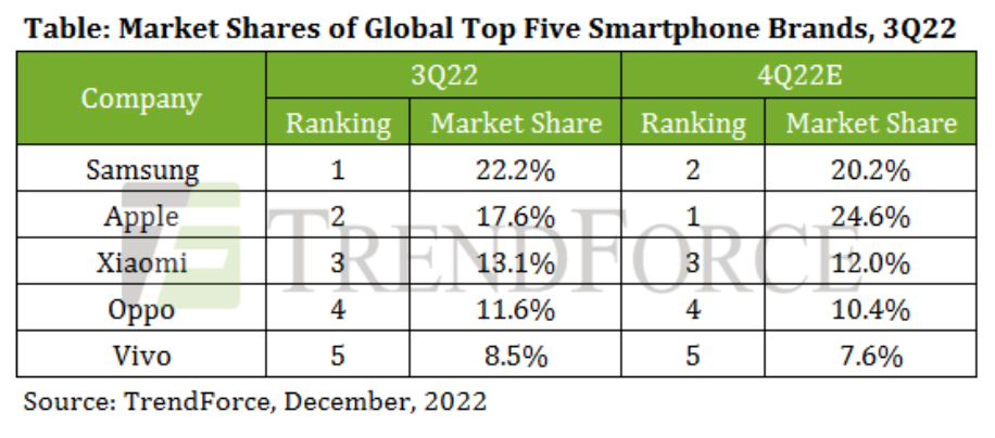 Apple ha prodotto 50,8 milioni di smartphone e segna una quota di mercato del 17,6%. Secondo TrendForce, questo è il periodo di produzione più forte per l’azienda di Cupertino, che sta promuovendo le vendite dei suoi nuovi iPhone 14.