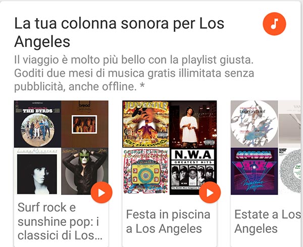 La nuova funzionalità si propone di trasportare i viaggiatori nella destinazione scelta attraverso playlist tematiche ispirate alla meta. Durante l’organizzazione del viaggio, gli utenti potranno portare il mood vacanziero a un nuovo livello accedendo a queste playlist: potranno ascoltare Caffè Italiano sorseggiando un espresso a Roma, catapultarsi nel Sound Tecno dei Club Berlinesi o ballare al ritmo Funk di San Paolo, solo per citare alcune playlist. L’app permetterà di ascoltare varie colonne sonore, conosciute o di nicchia, ispirate a destinazioni popolari in tutto il mondo. Gli utenti potranno inoltre avere accesso illimitato agli oltre 35 milioni di brani musicali presenti nel catalogo di Google Play Music, ai consigli personalizzati e potranno ascoltare la musica offline.