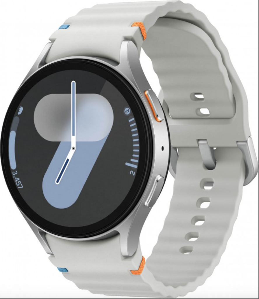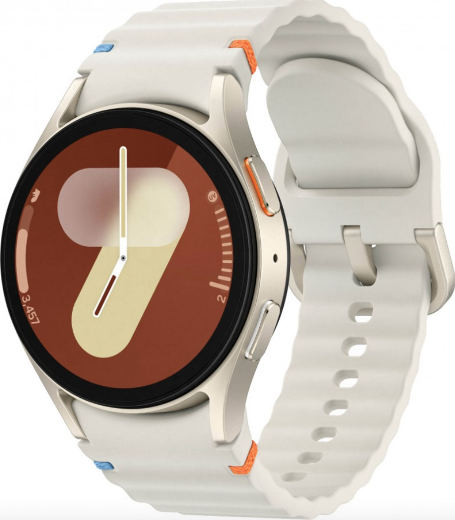 Passando ai dispositivi indossabili, Galaxy Watch7 sarà disponibile in almeno tre colori: crema, argento e verde scuro. Possiamo vedere che tutte e tre le colorazioni avranno inserti di tessuto blu e arancione nei cinturini dell’orologio.