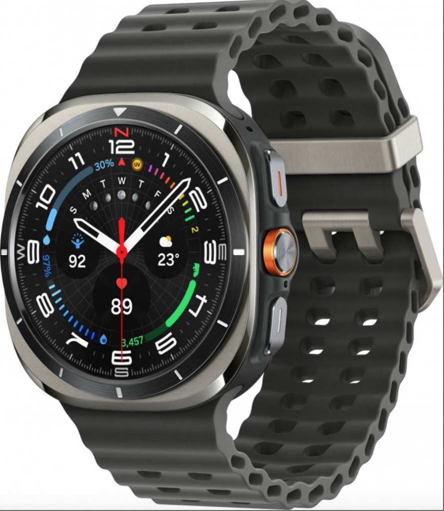 Galaxy Watch Ultra è mostrato in grigio scuro, argento e arancione.