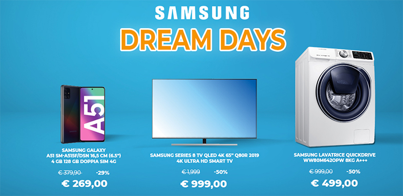 I Samsung Dream Days spaziano dagli smartphone agli elettrodomestici per la cucina, dai tablet agli accessori, dai Tv agli smartwatch. Insomma, davvero un po’ di tutto quello di cui il consumatore può necessitare.