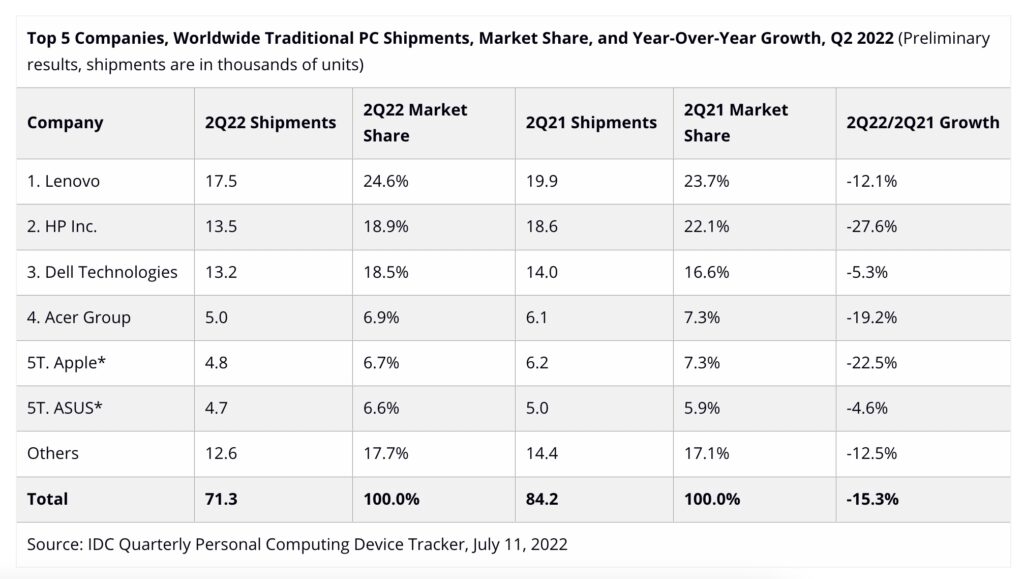 Il calo maggiore è stato registrato da HP, poiché le vendite dell’azienda sono diminuite da 18,6 milioni di unità nel secondo trimestre del 2021 a 13,5 milioni di unità nello stesso trimestre di quest’anno.