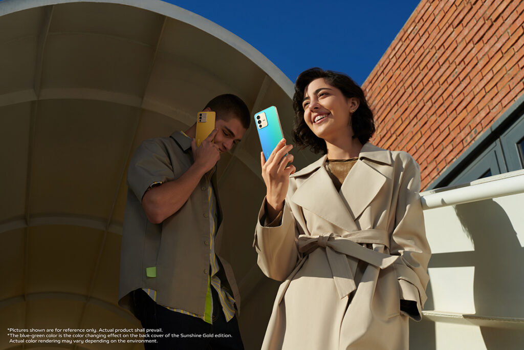 La versione Sunshine Gold di vivo V23 5G è stata realizzata con una scocca posteriore in vetro fotocromatico: una volta esposto alla luce UV, il telefono cambia colore passando da una calda sfumatura sunshine gold alla tonalità più fredda coast green.