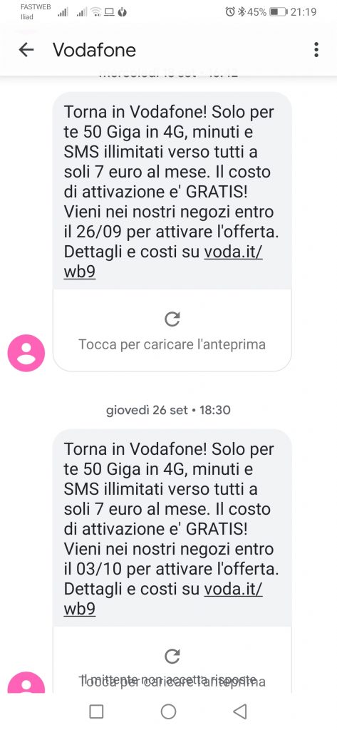 Vodafone a caccia di ex clienti con un’offerta di Win Back del costo di 7 euro al mese. Non passa settimana che sui telefonini della redazione non arrivi questo messaggio: