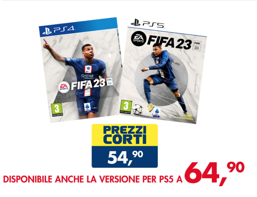 Il prezzo in promo della versione di Fifa 23 nel volantino Esselunga è di 54,90 euro per la PS4 e di 64,90 euro per la PS5.