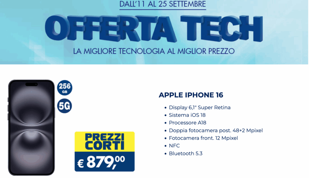 Dal 11 al 25 settembre il nuovo volantino Esselunga dedica ampio spazio alla tecnologia con l’iniziativa “Offerta Tech”. In prima linea c’è l’iPhone 16 da 256 GB, disponibile a 879 euro, un prezzo competitivo per chi desidera mettere le mani sul nuovo modello Apple senza attendere i canali tradizionali.