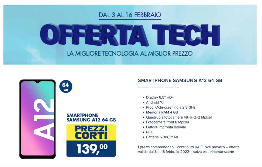 Torna il volantino Esselunga con l’offerta tech, che per si concentra sullo smartphone Samsung A12, nella versione con 64 GB di memoria di archiviazione.