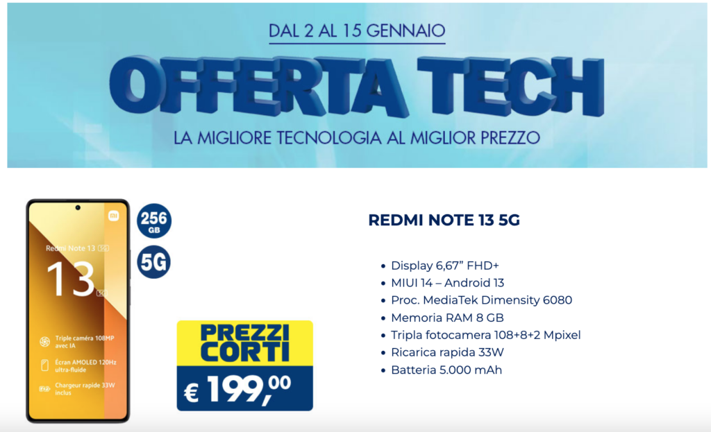 Il nuovo volantino Esselunga dedicato all’Offerta Tech propone, a un prezzo scontato, lo smartphone Xiaomi Redmi Note 13 5G, uno dispositivo caratterizzato da un eccellente rapporto qualità-prezzo.