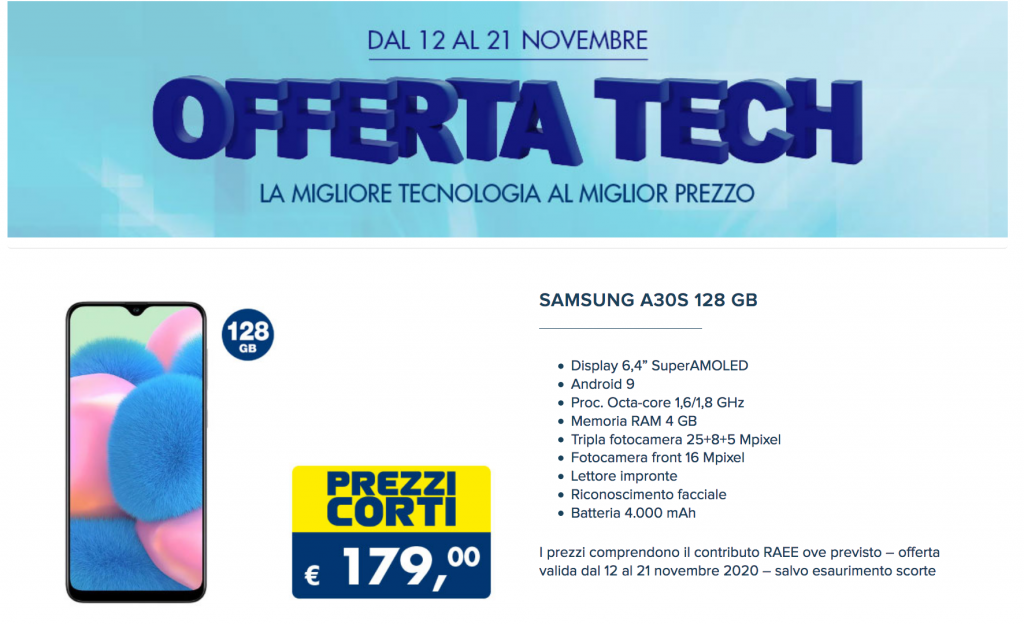 Il Samsung A30S, sarà disponibile al prezzo di 179 euro, ma solo fino al 21 novembre, in tutti i punti vendita che aderiscono all’iniziativa del più recente volantino Esselunga (trovate QUI l’elenco dei negozi).