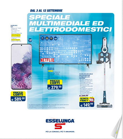 Esselunga propone un nuovo volantino multimediale, nel quale è possibile trovare un grande numero di prodotti a prezzi scontati. Lo «Speciale Multimediale ed Elettrodomestici» si articola in otto pagine e riguarda smartphone, accessori, TV, tempo libero, elettrodomestici e cura della persona.