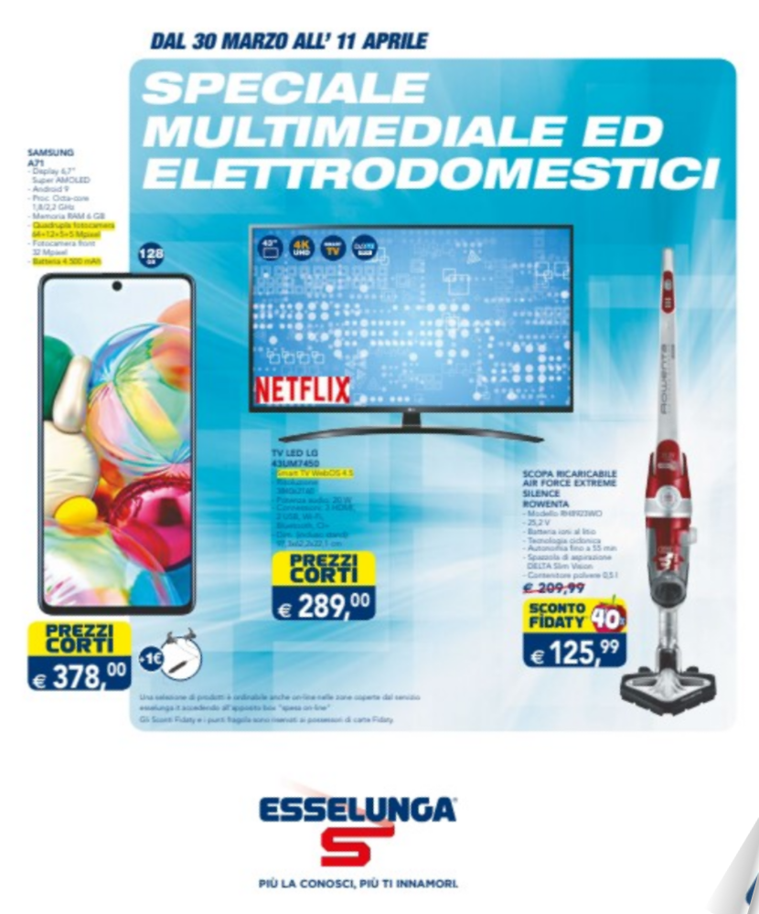 Esselunga ha prorogato la validità del suo volantino, esclusivamente dedicato a smartphone, tablet, Tv, prodotti multimediali e piccoli elettrodomestici, che avrebbe dovuto scadere l’11 aprile, al 24 aprile.