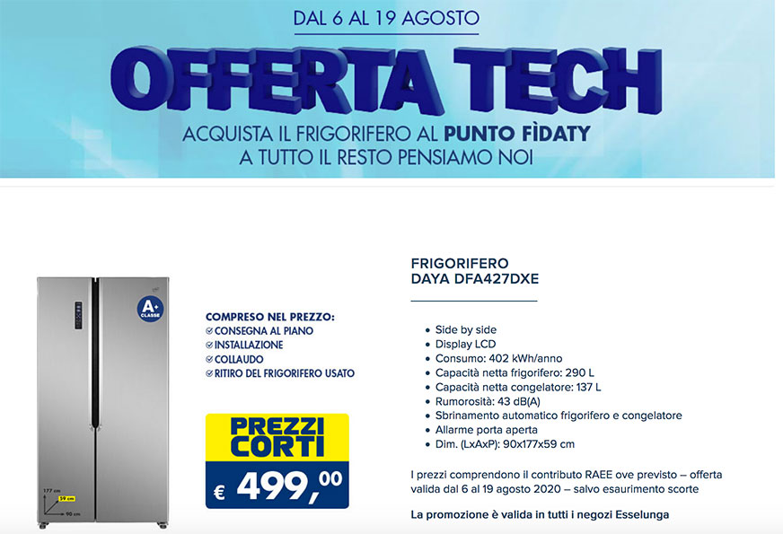 Il prezzo dell’offerta tech del volantino Esselunga per questo frigorifero è di 499 euro, e comprende la consegna al piano, l’installazione, il collaudo e il ritiro del frigorifero usato.